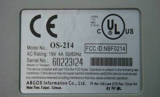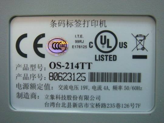 翻转Argox OS214TT条码打印机至後方有一产品标签纸,请观察在标签纸上的讯息,Argox OS214TT条码打印机真品均有3C防伪标志,除认证标志、产品型号及产品序号之外其他文字叙述内容都是中文;仿冒品则无1、”条码标签打印机 ”字样;2、无3C标志3、文字皆以英文字为主。图片如下: