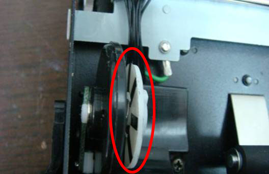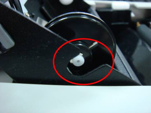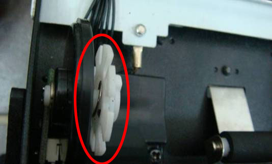打开Argox OS214TT条码打印机顶盖及松开打印头模组,此时请观察左下碳带座,新款Argox OS214TT条码打印机设计为有黑白相间的条纹,旧款Argox OS214TT条码打印机设计为八角齿轮并无黑白相间的条纹,如是您在2007年02月以後购买新机的,并在新机发现左下碳带座为八角齿轮而非黑白相间条纹时,则可判定为仿冒品。图片如下: